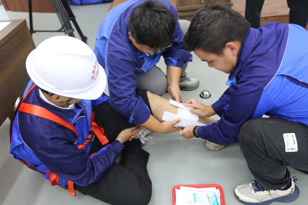 随后的技能实操环节将整个竞赛推向高潮。该环节设置了安全带(安全帽)穿戴、心肺复苏和创伤性骨折止血、包扎、固定等多个模拟真实灾害场景救援的竞赛项目。各参赛队伍精神饱满、反应迅速、操作规范,评委组严格按照评分标准进行了公正评判。经过激烈的比拼,最终中铁十二局集团有限公司、广东省基础工程集团有限公司凭借出色的综合表现荣获一等奖。