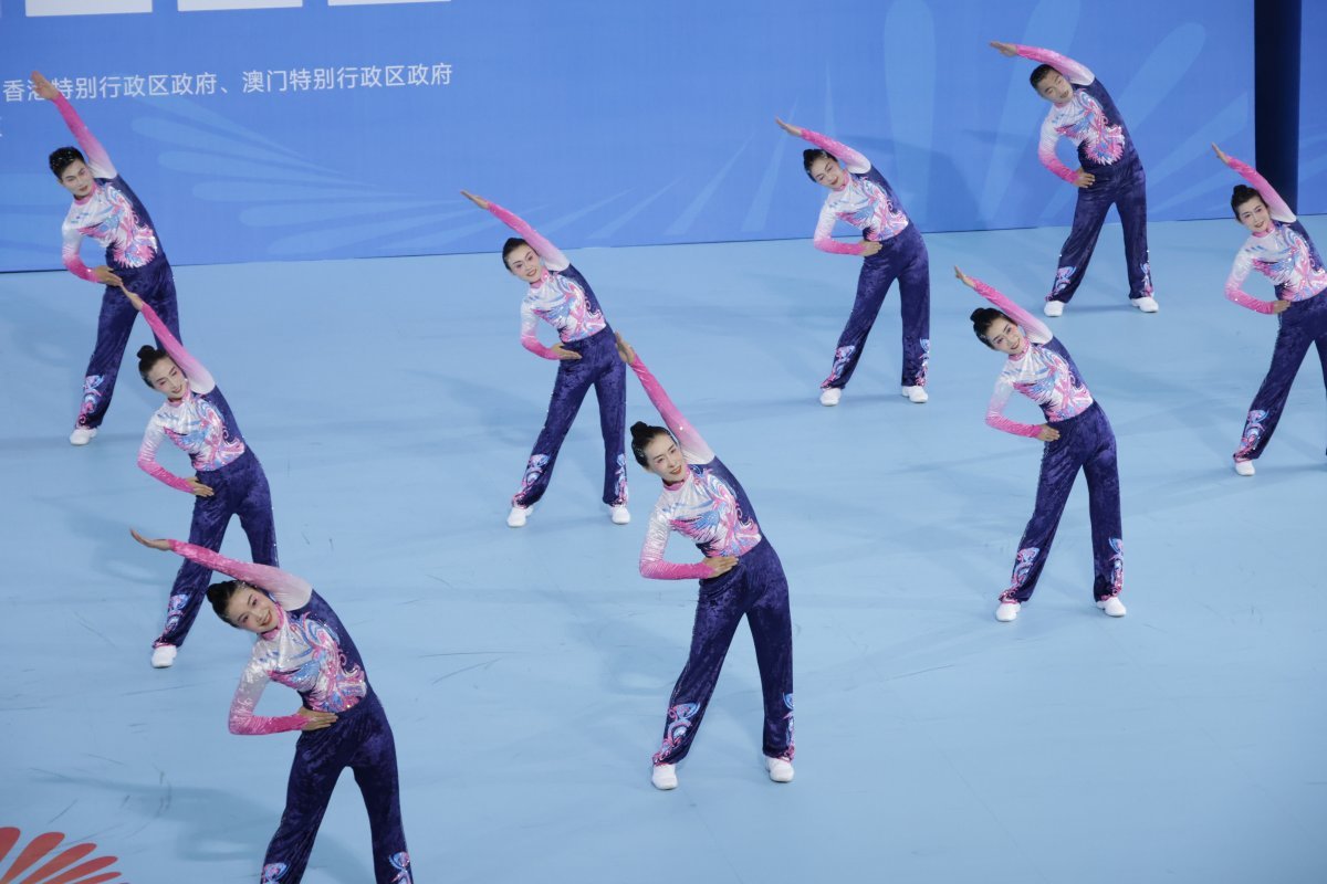 珠海承办的广播体操群众展演决赛尤为亮眼。9月21日,中山大学珠海校区体育馆内,来自内地及香港特别行政区的10支队伍、200名选手同台竞技。这些参赛选手来自各行各业,涵盖不同年龄层,他们通过日常刻苦训练,在全运会的舞台上展现了群众体育的深厚基础及蓬勃向上的风采。