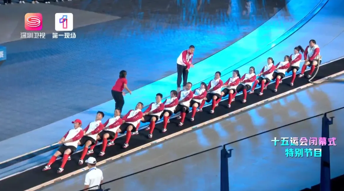 11月21日晚,第十五届全国运动会闭幕式在深圳宝安欢乐剧场举行。在暖场环节的十五人制混合1100公斤级拔河决赛中,珠海市代表队力克中山队夺得冠军,展现了珠海群众体育的活力与实力。