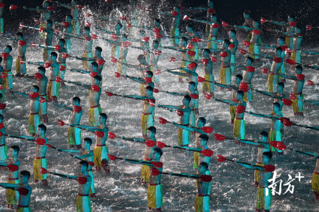 3790平方米的水上舞台出现在海面上,远处的城市天际线与舞台融合,呈现出以海天为幕,以城市为景,全民参与,全城共赴,共谱大湾区携手发展盛景。舞台上方的吊屏显示星星点点的萤火虫,漫天星辰闪烁,幻化出一只栩栩如生的深圳市市鸟黑脸琵鹭,缓缓接近纸面舞台,衔起舞台的一角,烂漫、梦幻,既展现岭南生活的安宁美好,也寓意习近平总书记指出的“深圳是中国特色社会主义在一张白纸上的精彩演绎”。
