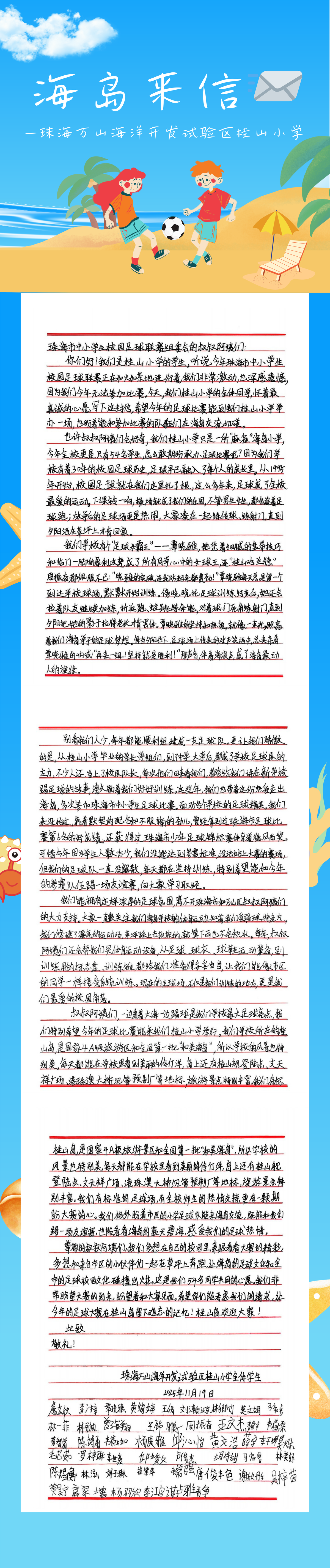 11月21日,一封来自桂山小学全体学生的亲笔信,跨越碧波,送到了“活力校园•快乐足球”2025珠海市中小学生校园足球联赛组委会的桌上。信中孩子们用稚嫩而真诚的笔触,表达了他们对足球的热爱、对大赛的向往,以及一个共同的愿望——希望能在自己的海岛上,迎来一场真正的足球友谊赛。