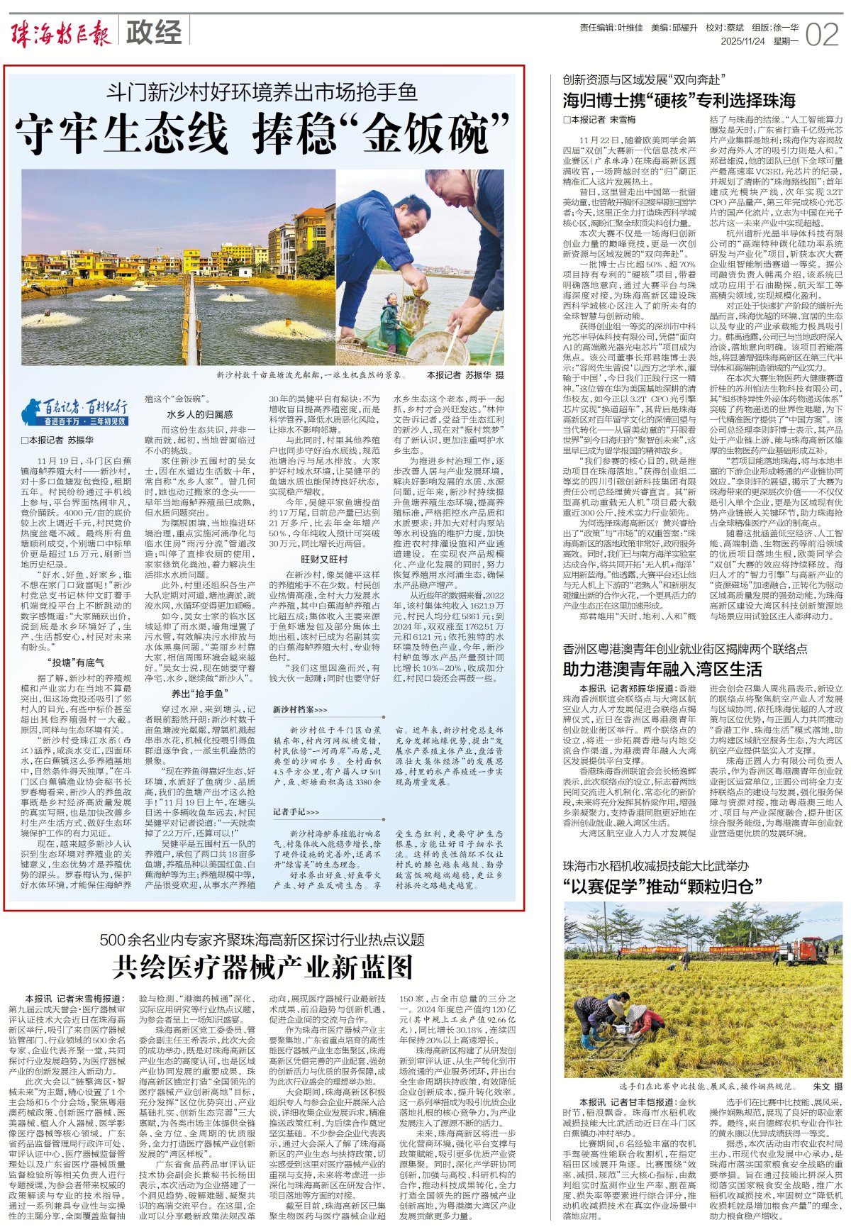 “新沙村受珠江水系(西江)涵养,咸淡水交汇,四面环水,在白蕉镇这么多养殖基地中,自然条件得天独厚。”在斗门区白蕉镇渔业协会秘书长罗春梅看来,新沙人的养鱼故事既是乡村经济高质量发展的真实写照,也是加快改善乡村生产生活方式、做好生态环境保护工作的有力见证。