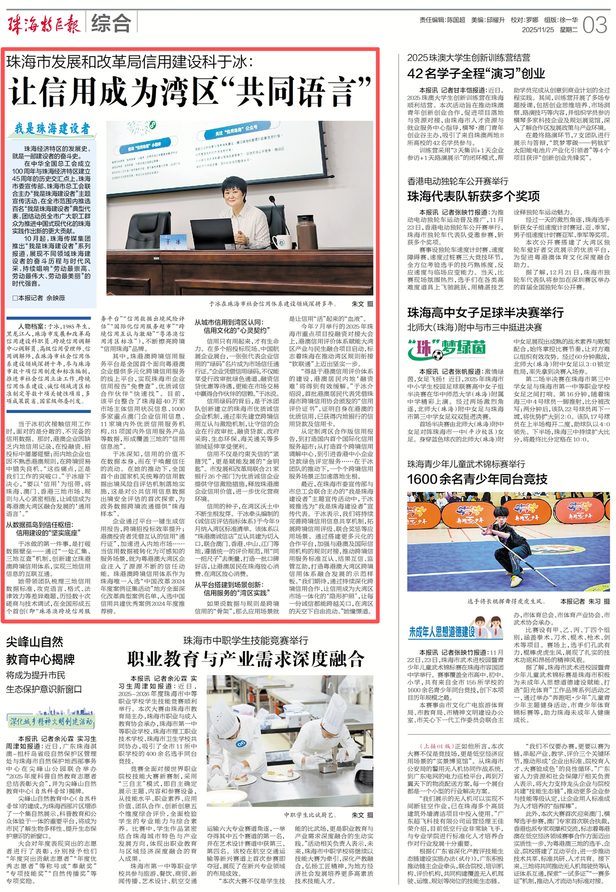 最近,在珠海市委宣传部与市总工会联合主办的“我是珠海建设者”主题宣传活动中,于冰被推选为“我是珠海建设者”宣传代表。于冰表示,将持续完善跨境信用信息共享机制,拓展跨境信用评级、联合奖惩等应用场景。通过搭建更多元化的合作平台,加强与港澳及国际信用机构的规则对接,推动跨境信用服务标准互认、结果互信、监管互助,打造粤港澳大湾区跨境信用体系融合发展的示范样板。“我们期待,通过持续深化跨境信用合作,让信用成为大湾区市场一体化的‘隐形护照’,让每一份诚信都能跨越关口,在湾区的天空下自由流动。”她憧憬道。