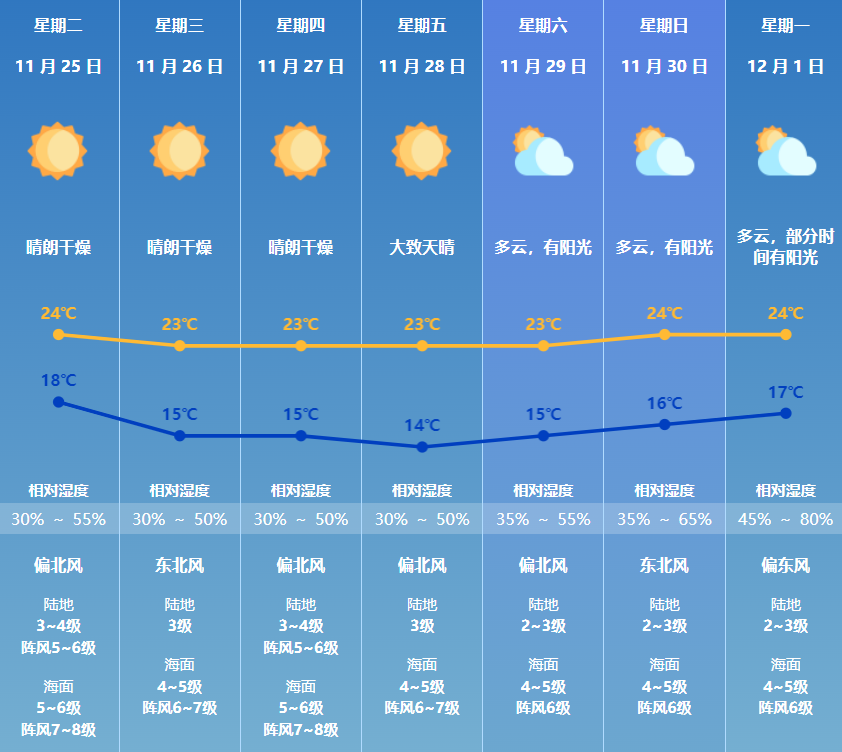 珠海方面,预计25日起受弱冷空气持续影响,晴朗干燥天气持续,北风加大,气温有所下降,海面阵风间中可达7-8级。