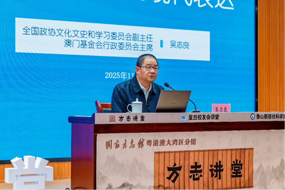 11月23日下午,“珠海复旦校友会讲堂”第一期、“香山新语”社科学堂第四期与“方志讲堂”第七期在珠海联合举行,特邀全国政协文化文史和学习委员会副主任、中华海外联谊会副会长、澳门基金会行政委员会主席、澳门文化界联合总会会长吴志良博士担任主讲嘉宾,以“澳门历史文化的现代表达”为题作精彩报告。本次活动由珠海复旦创新研究院、复旦大学珠海校友会联合珠海市社会科学界联合会、国家方志馆粤港澳大湾区分馆共同主办,吸引了来自珠海、深圳、广州、香港、澳门等地的文化社科界人士、高校校友、企业代表及社会各界观众300余人参与。