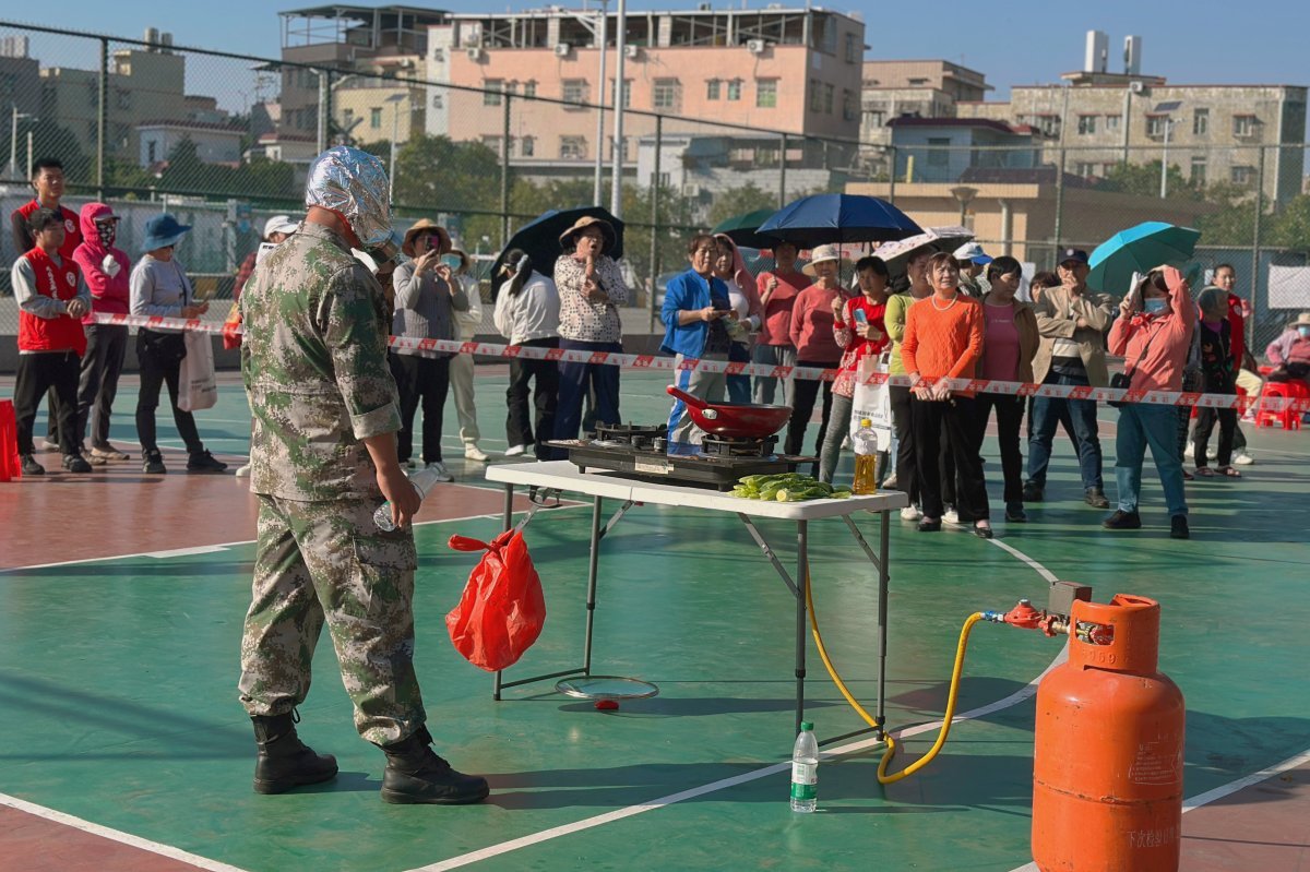 紧随其后的“烈火实战”演示环节尤为引人注目。教练模拟了日常生活中常见的油锅起火场景,首先展示了错误扑救方式可能引发的危险后果,随后沉着冷静地演示了“盖锅盖”、“放蔬菜”等科学有效的灭火步骤。真实的模拟场景让现场居民屏息凝神,深刻认识到掌握正确方法的重要性。