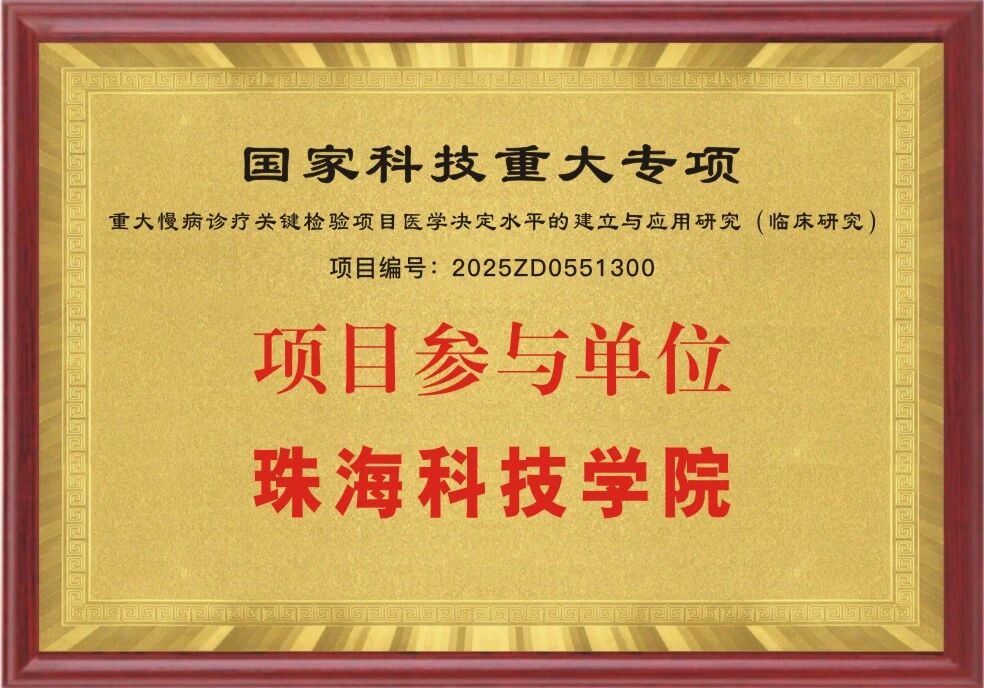 近日,国家卫生健康委医药卫生科技发展研究中心正式公布了2025年度癌症、心脑血管、呼吸和代谢性疾病防治研究国家科技重大专项立项名单。珠海科技学院首次参与该级别科研项目,获批两项重要课题,实现“零的突破”。