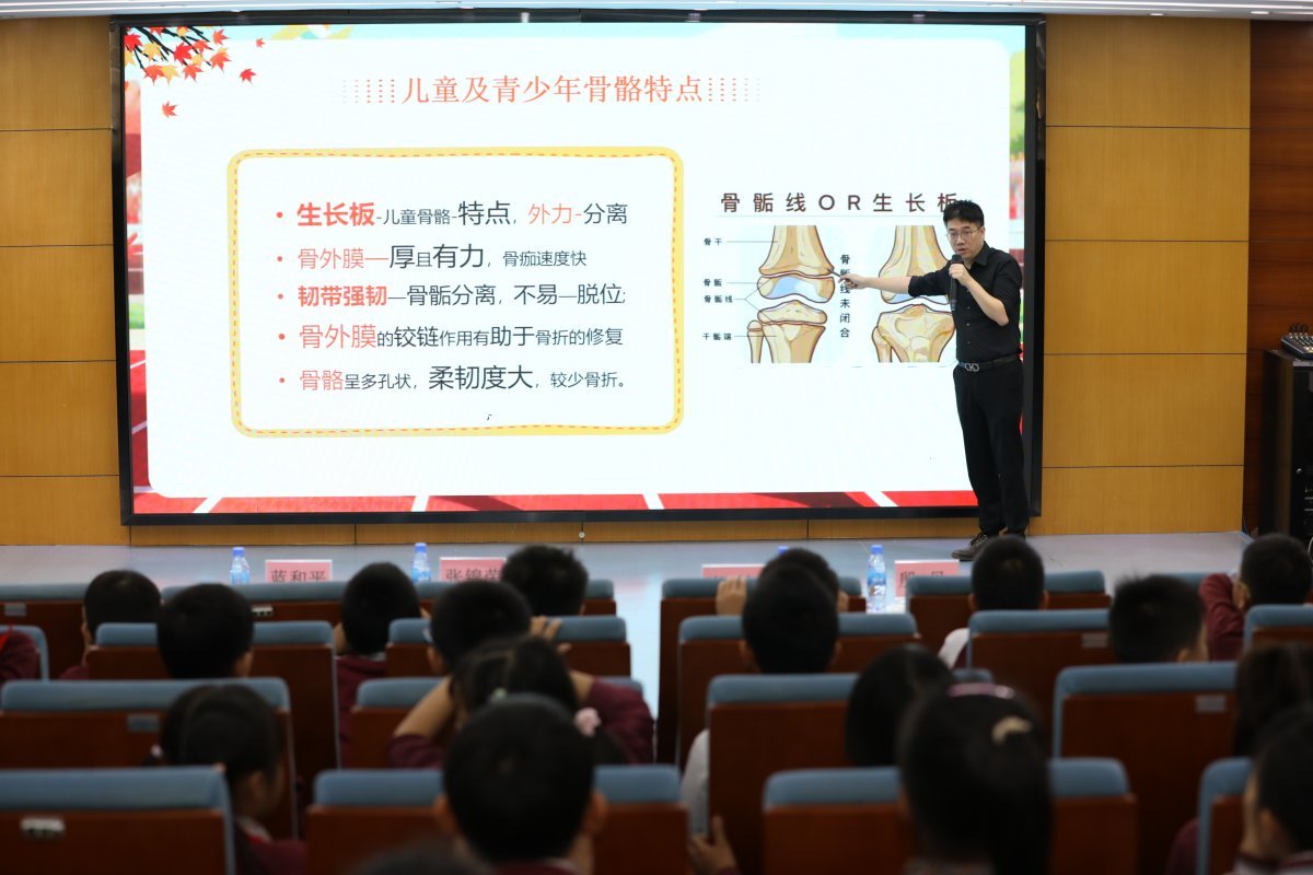 当天,学校举行主题为“科学运动 跃燃操场”的健康讲座,由珠海市人民医院关节与运动医学科副主任医师欧阳剑锋主讲。如何让孩子们的运动更安全?他结合临床经验,向师生讲解科学运动的重要性,并介绍扭伤、拉伤等常见运动损伤的识别、预防及应急处理方法,现场互动积极,气氛热烈。