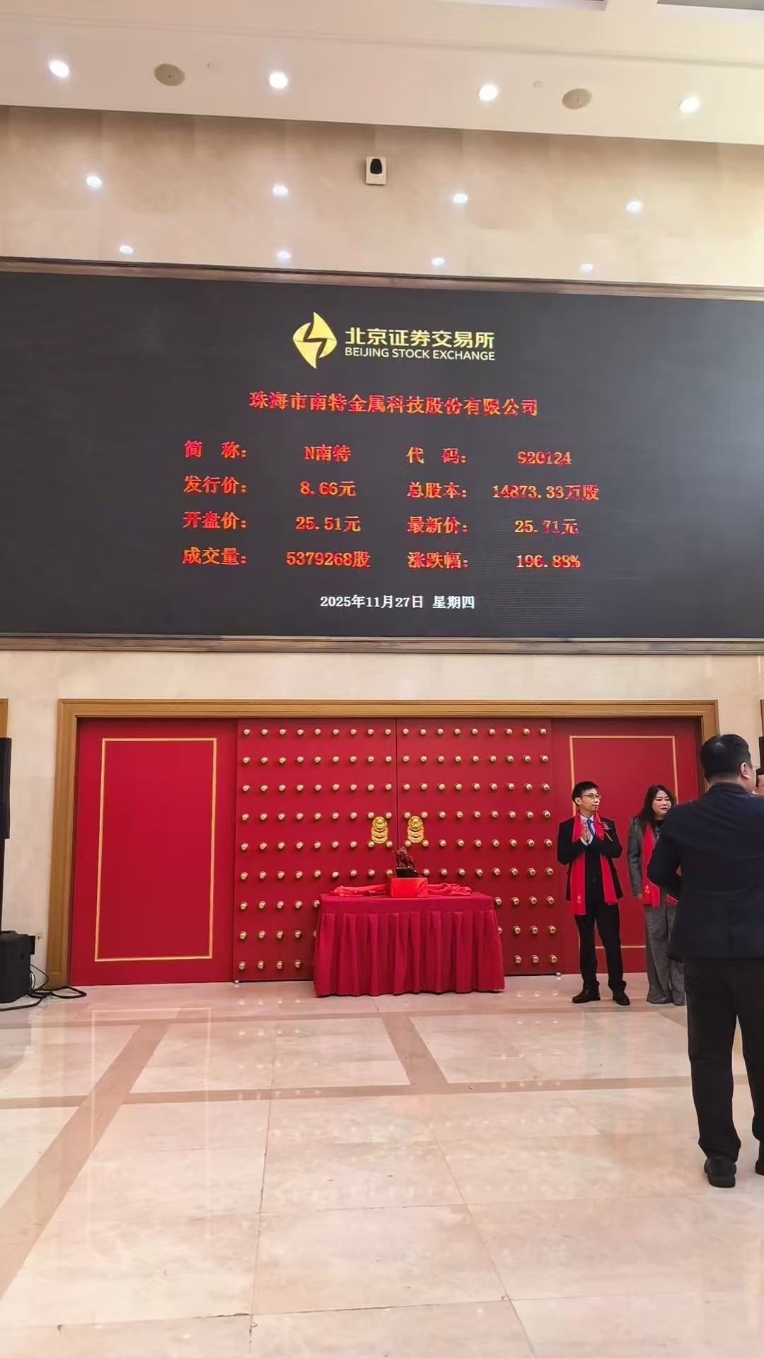 11月27日上午,随着北京证券交易所(下称“北交所”)钟声鸣响,珠海市南特金属科技股份有限公司(简称“南特科技”,股票代码:920124)正式上市,成为珠海市第52家上市公司,也是金湾区今年首家登陆北交所的企业,发行价8.66元/股,募资3.22亿元。