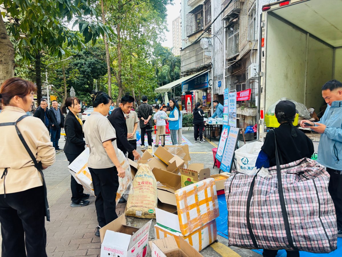 活动现场设置了“垃圾分类飞行棋”“我是分类小能手”等互动游戏,吸引众多居民踊跃参与。在回收区域,志愿者对居民送来的旧衣物、纸皮、塑料瓶等可回收物逐一登记,并详细介绍“分类变现助公益”机制。居民可自主选择将回收物捐赠或售卖,由明道小海豚公司统一清运,实现资源循环与爱心传递的双重价值。现场还设有“爱心环卫驿站”,为环卫工人免费提供饮用水、口罩、手套等物资;有害垃圾回收处则为居民提供免费清运服务,助力生活垃圾源头减量与安全处置。