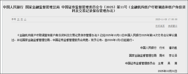11月28日,中国人民银行、国家金融监督管理总局、中国证监会联合发布《金融机构客户尽职调查和客户身份资料及交易记录保存管理办法》。其中,“个人存取现金超5万元需登记资金来源”的规定取消,与此前的征求意见稿保持了一致。