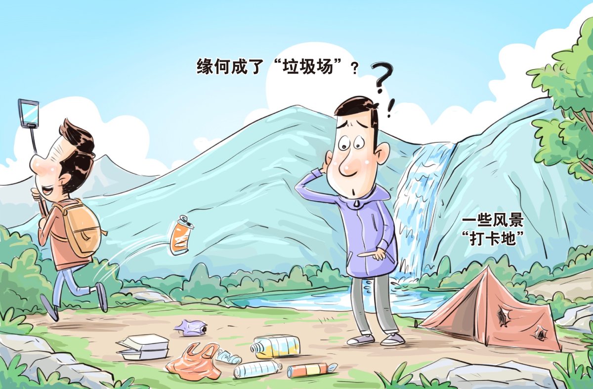 在贵州某县通往一处瀑布的山路两侧及瀑布下方的观景区域,果皮、塑料水瓶等垃圾随处可见;在华北某地郊区一处登山步道,尽管设置有“垃圾带下山,环保在心间”等劝导标语,但纸屑、口罩、玻璃瓶、饮料瓶等垃圾依旧散落林间。