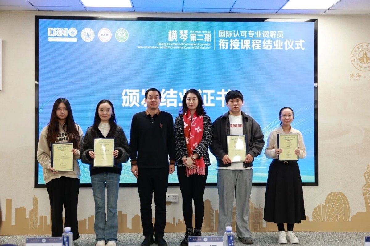活动现场为全体学员颁发了结业证书。此次课程的举办进一步充实了大湾区、合作区涉外法治人才储备,为推进区域争议解决机制一体化、国际化提供了坚实支撑。未来,“一中心两基地”将继续发挥平台优势,深化与港澳及国际机构的合作,持续打造高质量、国际化、专业化的调解员培训项目,架起跨境争议解决的专业桥梁,为大湾区和合作区的法治建设与经济高质量发展保驾护航。