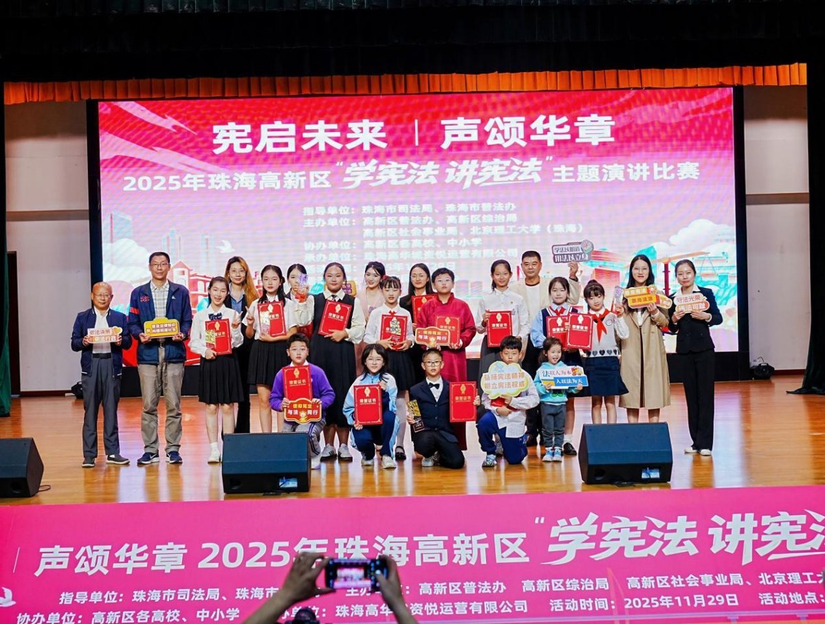 珠海市司法局、市普法办指导,高新区普法办、区综治局、区社会事业局以及北京理工大学(珠海)联合主办了此次活动。自11月比赛启动以来,便在全区范围内掀起了一股“学宪法、讲宪法”的热潮,报名通道开启后迅速收到逾300份参赛作品,经过严格的线上评审,最终15名优秀选手凭借扎实的内容、出色的表达与创新的形式脱颖而出,会师决赛。赛事首次实现小学、中学、大学全学段覆盖,不同年龄段的选手同台竞技,以各具特色的视角与表达,共同奏响尊崇宪法、学习宪法、遵守宪法、维护宪法、运用宪法的青春乐章。