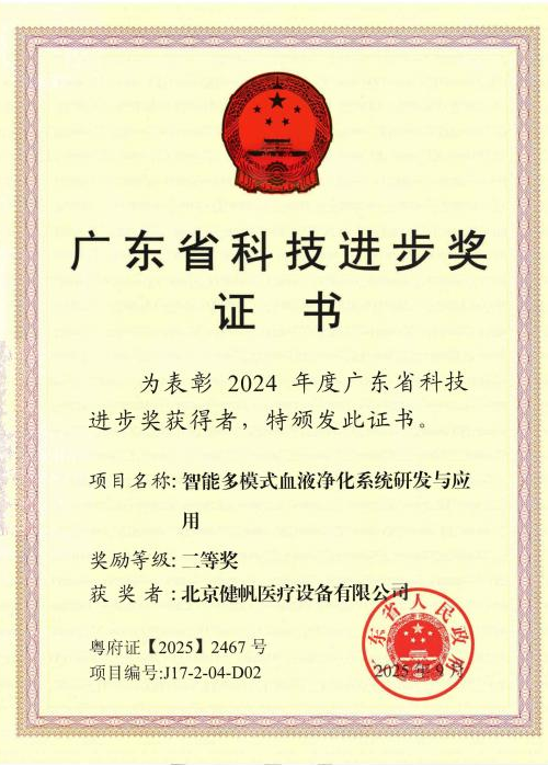 近日,2024年度广东省科学技术奖获奖名单正式公布。珠海高新区企业健帆生物科技集团股份有限公司联合北京健帆医疗设备有限公司共同完成的“智能多模式血液净化系统研发与应用(DX-10)”项目,荣获省科技进步奖二等奖,且为血液净化设备领域唯一获奖项目。