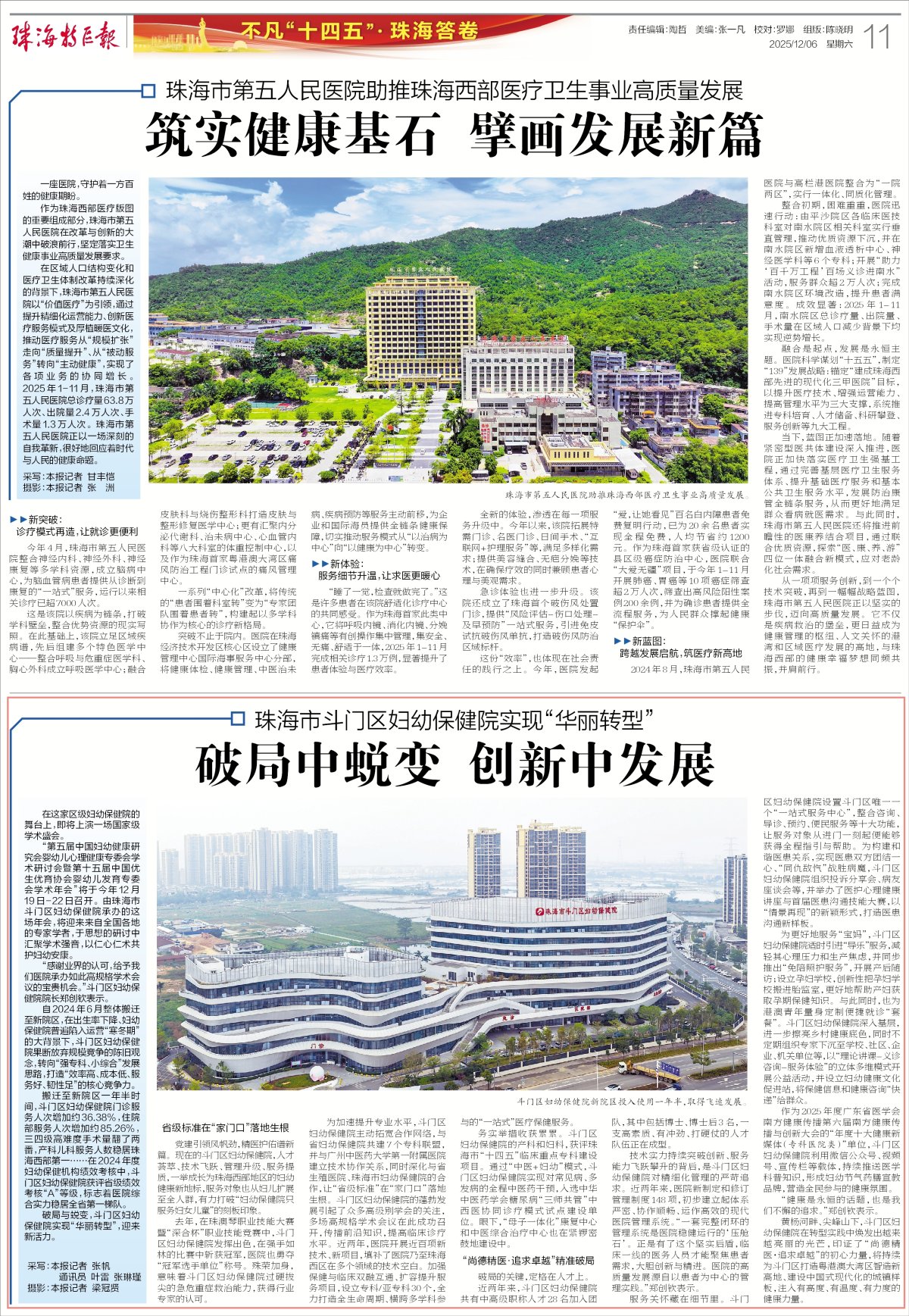 务实举措收获累累。斗门区妇幼保健院的产科和妇科,获评珠海市“十四五”临床重点专科建设项目。通过“中医+妇幼”模式,斗门区妇幼保健院实现对常见病、多发病的全程中医药干预,入选中华中医药学会糖尿病“三师共管”中西医协同诊疗模式试点建设单位。眼下,“母子一体化”康复中心和中医综合治疗中心也在紧锣密鼓地建设中。