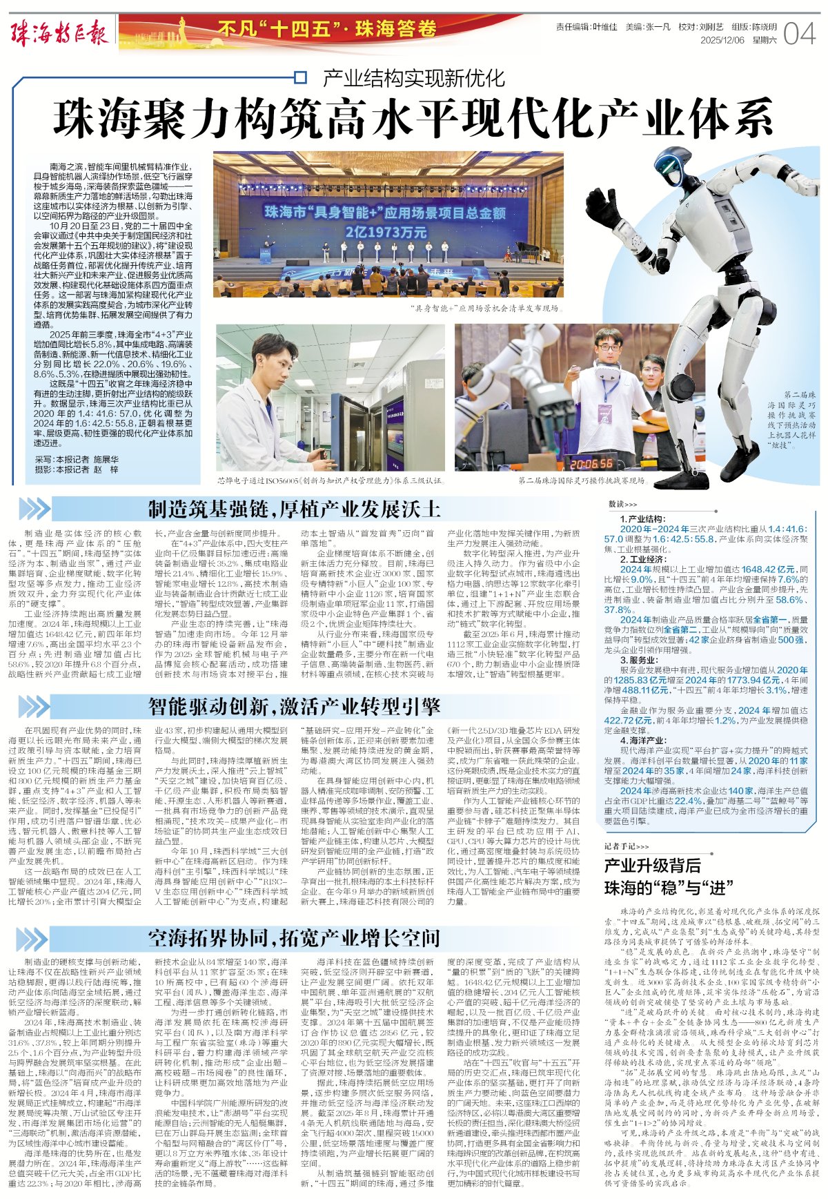从制造筑基强链到智能驱动创新,“十四五”期间的珠海,通过多维度的深度变革,完成了产业结构从“量的积累”到“质的飞跃”的关键跨越。1648.42亿元规模以上工业增加值的稳健增长、204亿元人工智能核心产值的突破、超千亿元海洋经济的崛起,以及一批百亿级、千亿级产业集群的加速培育,不仅是产业能级持续提升的具象化,更印证了珠海立足制造业根基、发力新兴领域这一发展路径的成功实践。