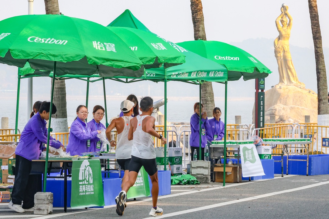在赛道30公里处的“能量加油站”,珠海城市职业技术学院学生何晓岚正快速有序地为选手递上饮料。“在这里,每一杯水、每一句加油,都可能成为跑者继续前行的力量!用服务传递温暖,我们感到无比自豪。”