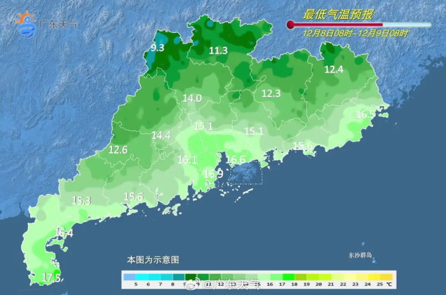 今天8日,广东南部市县多云间晴天,其余市县晴到多云;西部和北部市县早晚有轻雾或雾。最低气温:粤北市县9~12℃,粤西和珠江三角洲南部市县15~18℃,其余市县12~15℃。