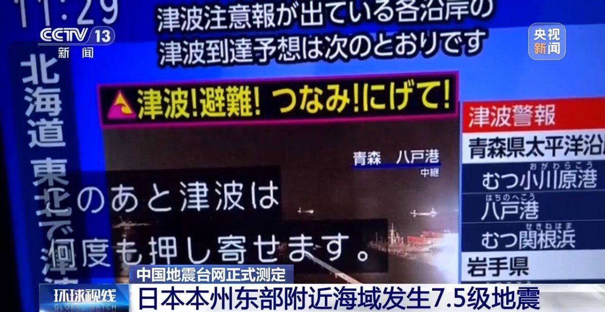 总台记者发回报道,东京等地有明显震感。日本气象厅当地时间12月8日23时23分发布海啸警报,预计部分海域将出现最高3米海啸,呼吁沿岸民众高度警戒。