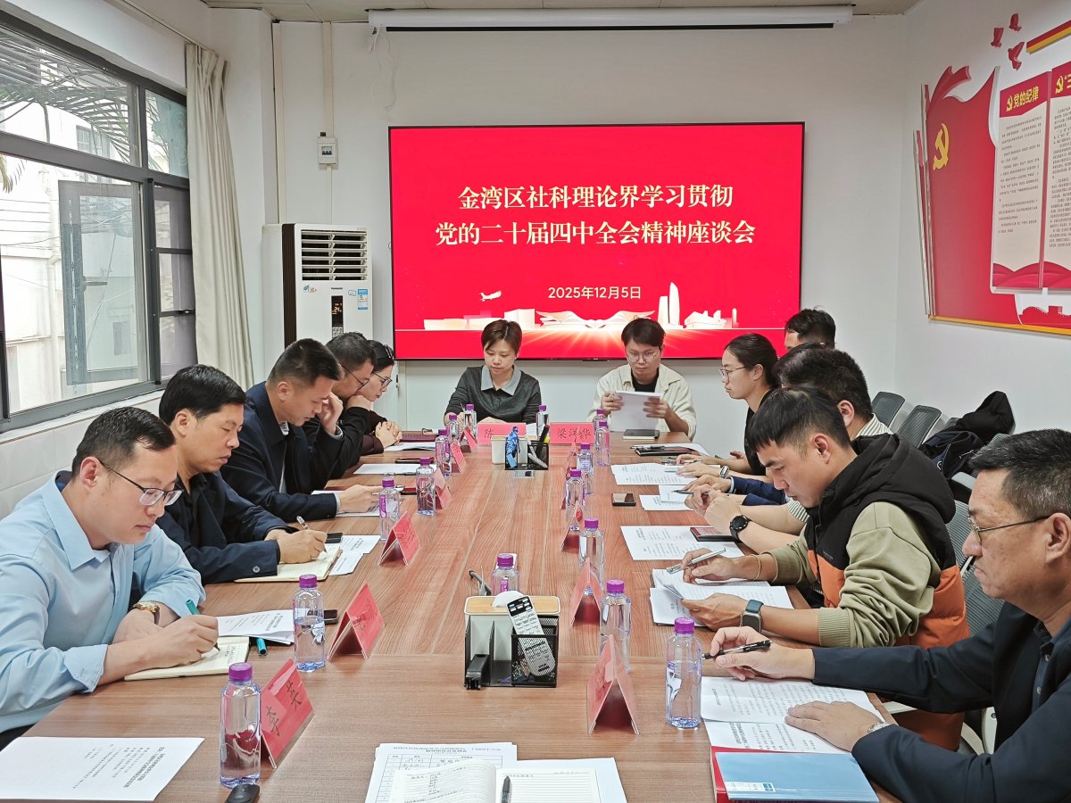 12月5日下午,金湾区社科理论界学习贯彻党的二十届四中全会精神座谈会召开,来自辖区高校的5位专家学者与区职能部门的8位业务骨干作交流发言。