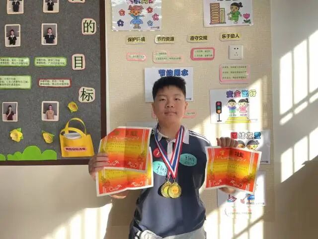 他热爱写作,参加“科技引领我成长”2023年少年儿童践行社会主义核心价值观主题征文活动,荣获小学组省级三等奖、市级二等奖;参加珠海市中小学庆祝中华人民共和国成立70周年“腾飞新中国,辉煌七十年”征文活动,荣获高中组三等奖。