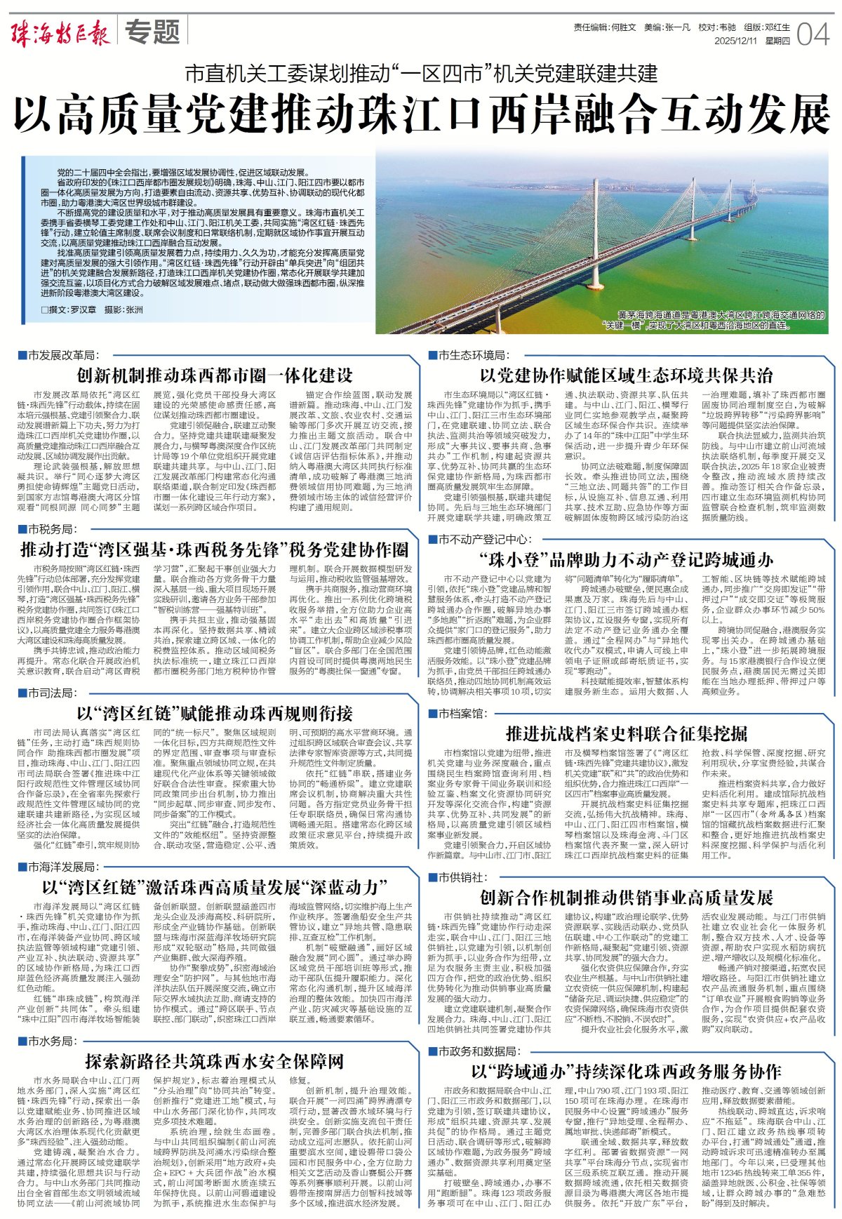 市税务局按照“湾区红链·珠西先锋”行动总体部署,充分发挥党建引领作用,联合中山、江门、阳江、横琴,打造“湾区强基·珠西税务先锋”税务党建协作圈,共同签订《珠江口西岸税务党建协作圈合作框架协议》,以高质量党建全力服务粤港澳大湾区建设和珠海高质量发展。