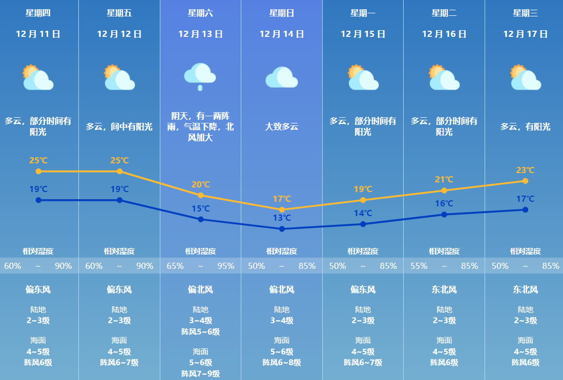 温馨提示:近期天气干燥,请注意森林防火和居家用火用电安全;13-14日海面风力大,气温显著下降,请注意防范大风和降温的影响。