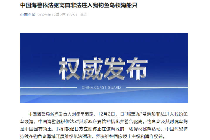 中国海警局新闻发言人刘德军表示,12月12日,菲律宾多批船只打着捕鱼的旗号,不顾中国海警一再劝阻和警告,执意赴中国南沙群岛仙宾礁海域滋事挑衅。中国海警对菲方船只依法依规采取喊话警告、外逼驱离等必要管控措施。中国对包括仙宾礁在内的南沙群岛及其附近海域拥有无可争辩的主权。中国海警将依法在中国管辖海域持续开展维权执法活动,坚决维护国家领土主权和海洋权益。
