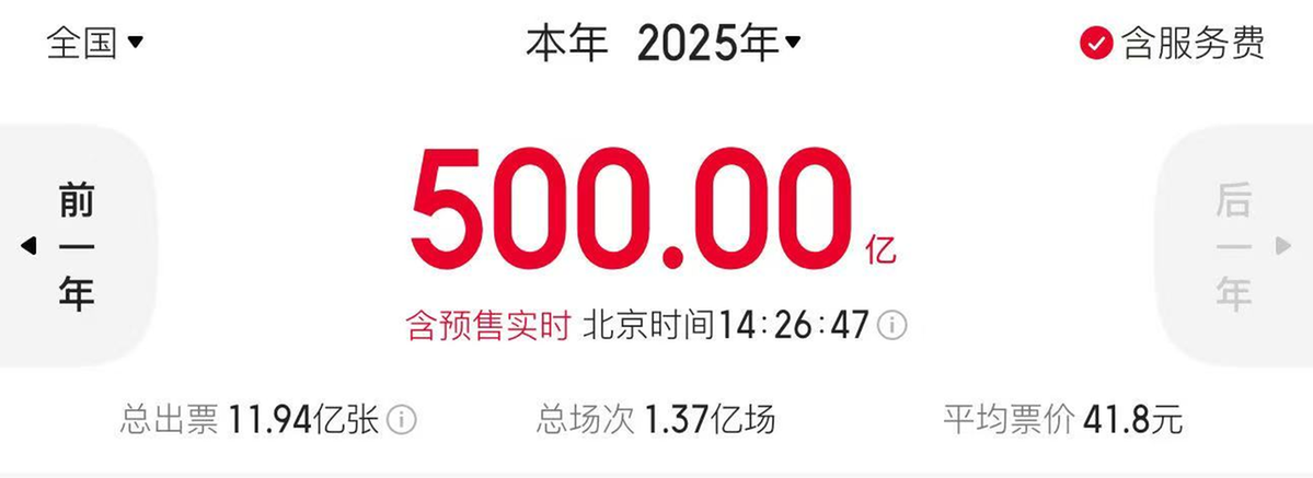 据网络平台数据,截至12月13日,2025年大盘票房(含预售)突破500亿元大关,全年观影人次超11.9亿,放映总场次超1.37亿。