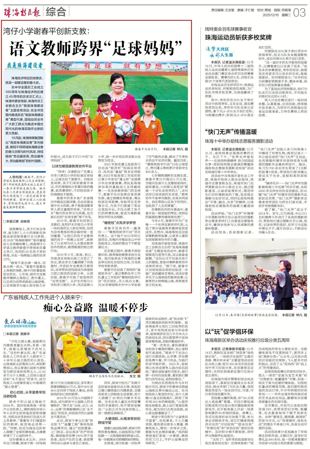 在珠海市委宣传部、珠海市总工会联合主办的“我是珠海建设者”主题宣传活动中,谢春平被推选为宣传代表,这让她备受鼓舞,“这份认可不仅是对我个人的激励,更是对粤黔教育协作成果的肯定。”接下来,谢春平计划将校园足球的经验进一步推广至西藏林芝等地,讲述好更多关于山海相连的教育故事,让教育的火种跨越山海,照亮更多孩子的未来。