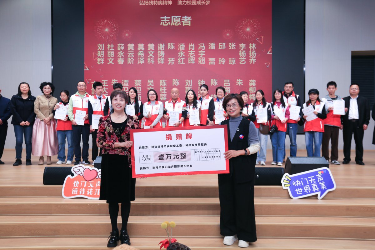 现场,民建珠海市委会企工委联合香洲基层委积极参与“快门无声”助残公益项目志愿活动,不仅捐赠一万元爱心款专项支持“快门无声”的发展,其近20名成员还来到珠海十中开展志愿服务,与师生面对面交流互动,用温暖陪伴和真诚分享为孩子们带来成长启迪。