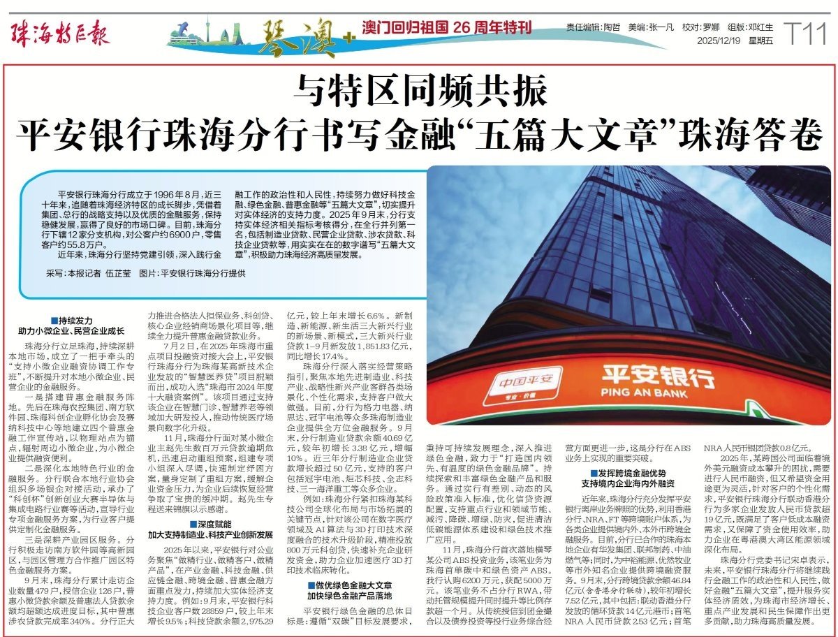 近年来,珠海分行坚持党建引领,深入践行金融工作的政治性和人民性,持续努力做好科技金融、绿色金融、普惠金融等“五篇大文章”,切实提升对实体经济的支持力度。2025年9月末,分行支持实体经济相关指标考核得分,在全行并列第一名,包括制造业贷款、民营企业贷款、涉农贷款、科技企业贷款等,用实实在在的数字谱写“五篇大文章”,积极助力珠海经济高质量发展。