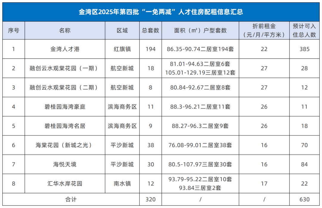 2025年第四批金湾区“一免两减”人才住房配租申请将于12月22日9:00启动,至2026年1月5日18:00截止。本批次共推出8个项目、320套精装修房源,配备家具家电,可拎包入住。