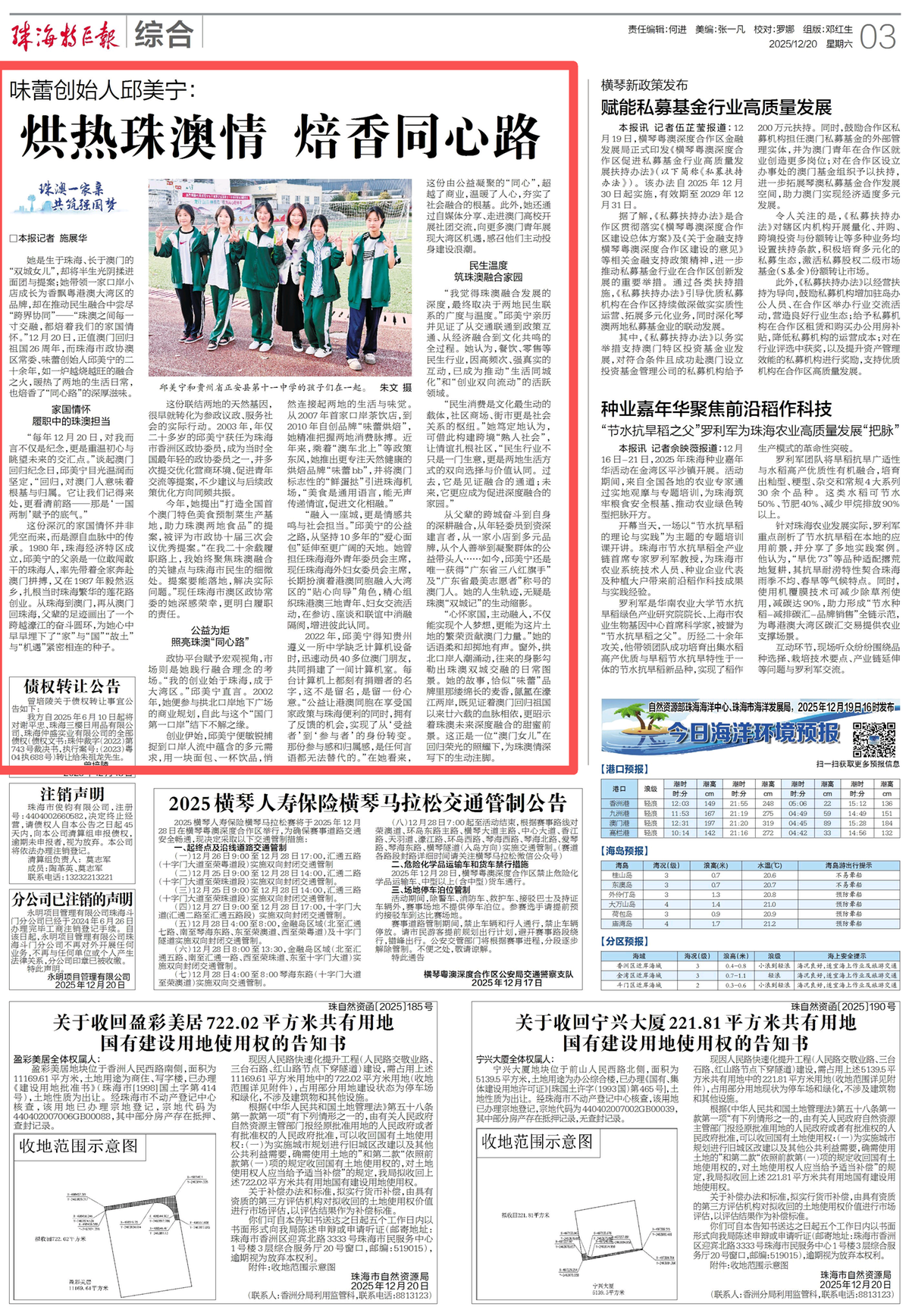 今年,她提出“打造全国首个澳门特色美食预制菜生产基地,助力珠澳两地食品”的提案,被评为市政协十届三次会议优秀提案。“在我二十余载履职路上,我始终聚焦珠澳融合的关键点与珠海市民生的细微处。提案要能落地,解决实际问题。”现任珠海市澳区政协常委的她深感荣幸,更明白履职的责任。