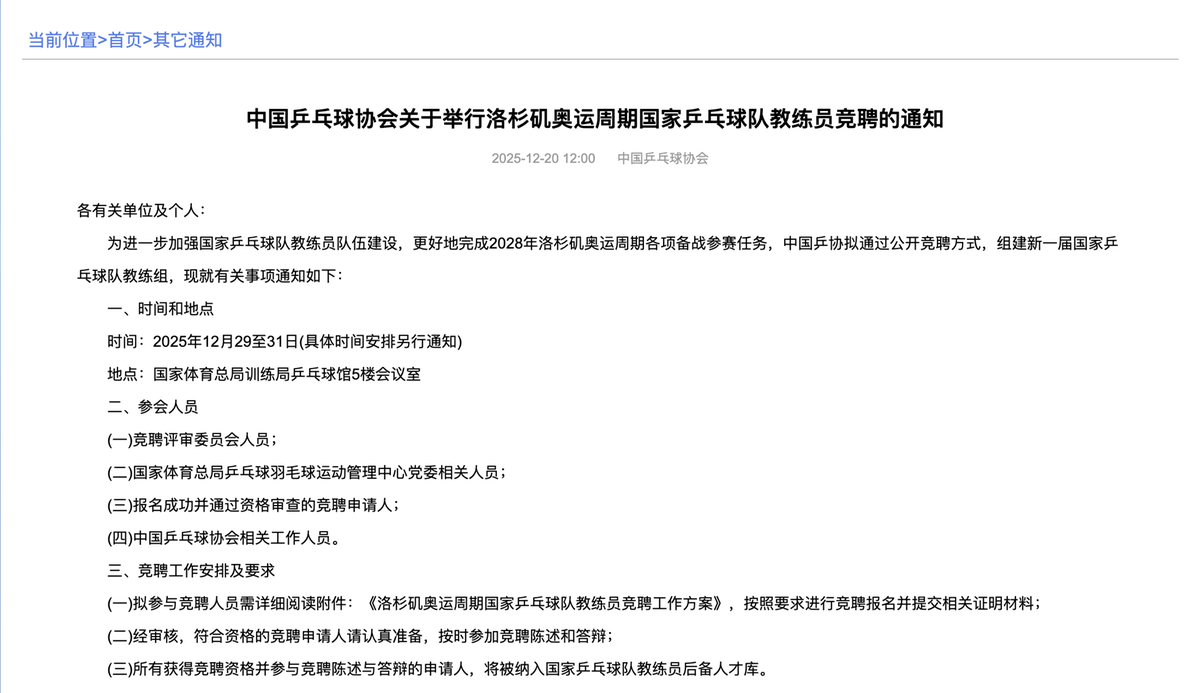 12月20日,中国乒乓球协会在官网发布《中国乒乓球协会关于举行洛杉矶奥运周期国家乒乓球队教练员竞聘的通知》,正式启动新周期国家队教练员公开竞聘工作。