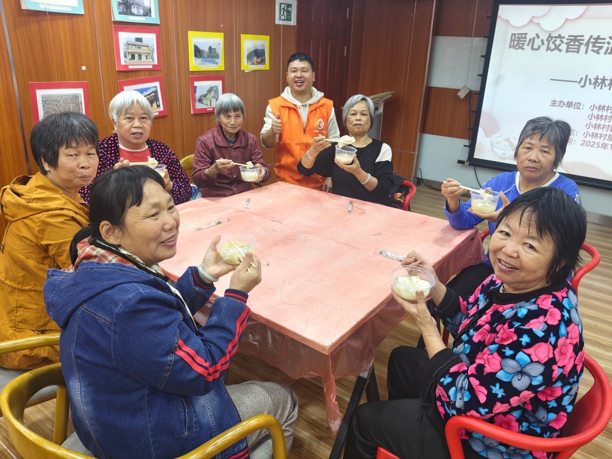 小林村居家养老服务站里笑声不断,“暖心饺香传温情,耆乐共学暖夕阳”活动在此温情开展。游戏互动环节,社工领着老人们舞动双手,比划着可爱的手势舞;包饺子环节,大伙儿你擀我包、默契十足。饺子出锅,热气腾腾,邻里围坐共享美味。志愿者们还将现包的饺子送到12名长者家中,让温情传递到更远的地方。