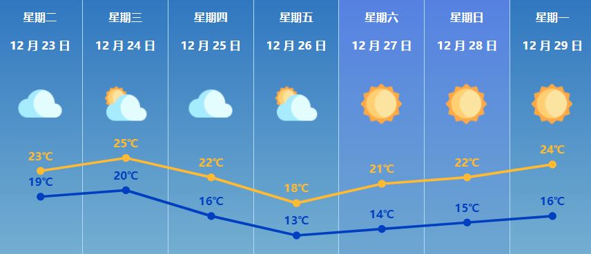 25日起新一股冷空气再次影响珠海,最低气温将降至13℃左右(26日),海面阵风加大至6-8级,海上交通及滨海旅游请注意安全。展望27日开始天色渐转晴好,气温回升,昼夜温差加大。