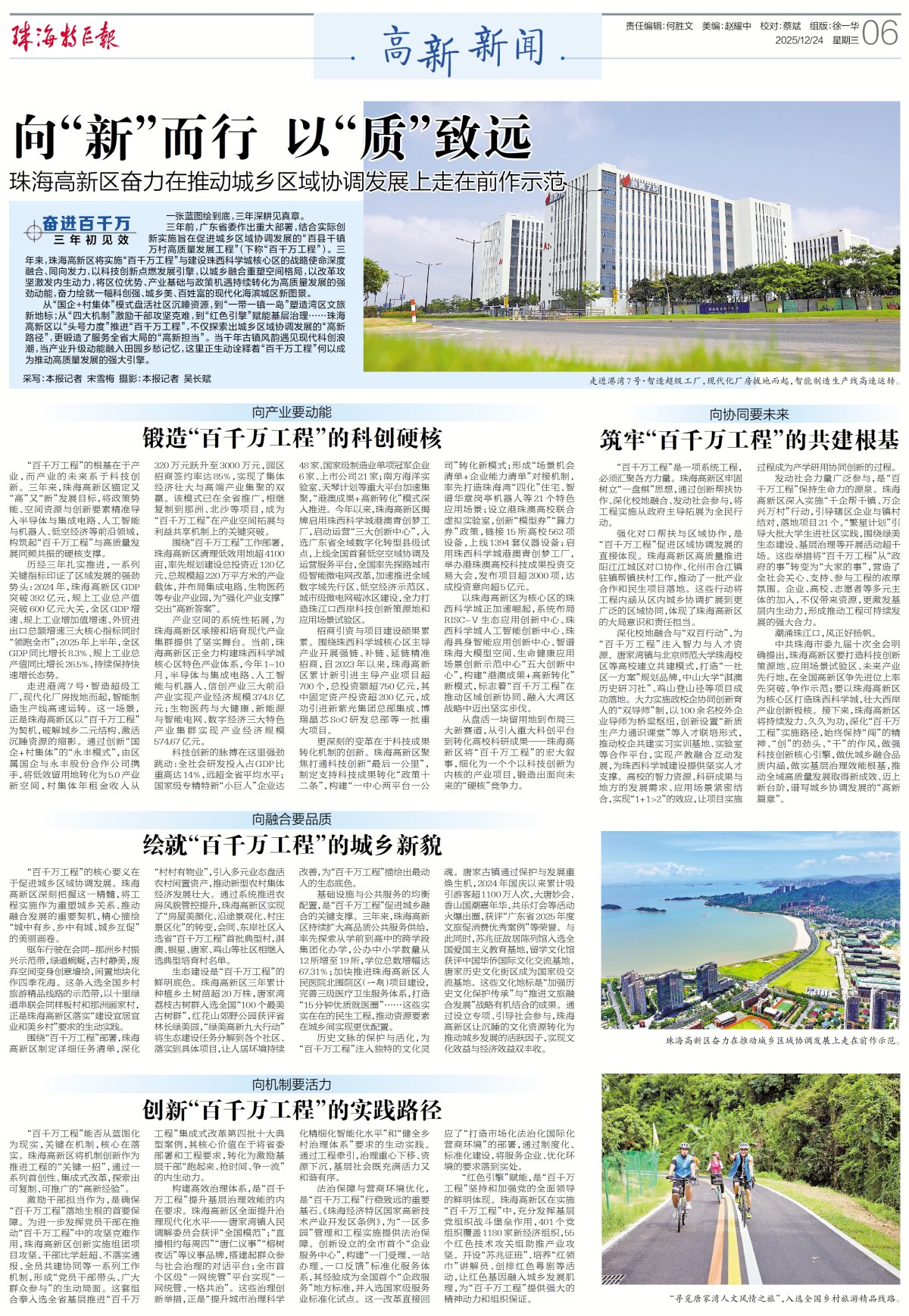 三年前,广东省委作出重大部署,结合实际创新实施旨在促进城乡区域协调发展的“百县千镇万村高质量发展工程”(下称“百千万工程”)。三年来,珠海高新区将实施“百千万工程”与建设珠西科学城核心区的战略使命深度融合、同向发力,以科技创新点燃发展引擎,以城乡融合重塑空间格局,以改革攻坚激发内生动力,将区位优势、产业基础与政策机遇持续转化为高质量发展的强劲动能,奋力绘就一幅科创强、城乡美、百姓富的现代化海滨城区新图景。