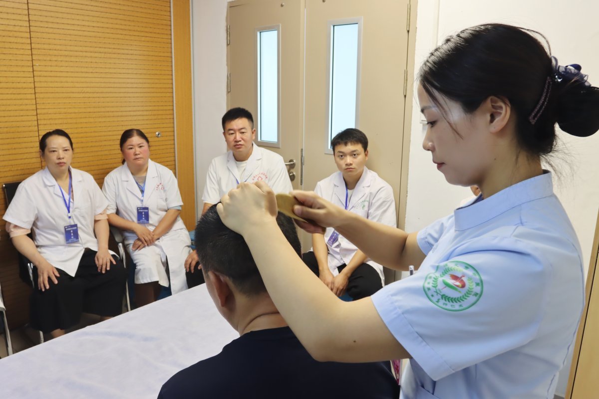 另一间培训室内,护理部中医治疗专科护士袁红霞正在示范艾灸的穴位定位与施灸技巧,学员们围拢上前,仔细观察手法与火候控制。“灸疗要因人而异,寒湿体质与气虚体质选穴不同,温度和时长也要调整。”她一边操作一边讲解。袁红霞已连续三年参与乡村医生培训带教工作,她指了指自己的微信聊天界面,“很多学员培训结束后还常发信息问我操作细节,看到他们把所学真正用在日常诊疗中,我心里特别欣慰。”她笑着说。