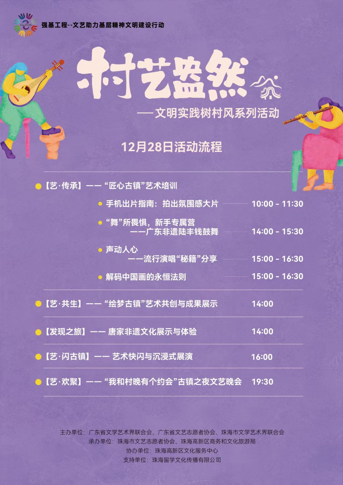 为推动文艺创作面向基层、服务人民,“村艺盎然”文明实践树村风系列活动将于12月28日在唐家古镇举行。活动由广东省文学艺术界联合会、广东省文艺志愿者协会、珠海市文学艺术界联合会联合主办,珠海市文艺志愿者协会、珠海高新区商务和文化旅游局承办,旨在通过丰富多彩的文艺形式,激活乡村文化内生动力,提升基层公共文化服务水平,让文艺的种子在乡村沃土生根发芽,结出文明硕果。