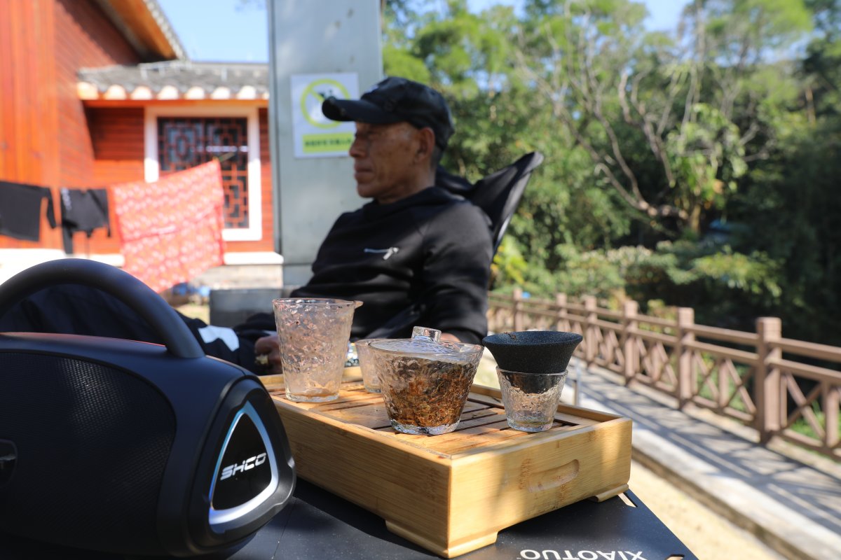来自武汉的梁先生夫妇,已经是第三年冬天选择木头冲作为旅居目的地。他们的房车停在营地东侧,车旁小桌上茶香袅袅。