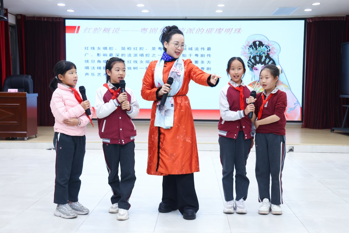 在随后的活动中,传习周依次走进金湾区四季学校、香洲区格力学校、斗门区斗门镇南门小学、高新区唐家小学,以“讲座+示范+互动”的方式开展校园传习,让红派粤剧走出剧场、走进课堂。作为市级粤剧传承基地,斗门区斗门镇南门小学粤剧社团的小演员们身着戏服带来表演,展现了新时代少年对粤剧的热爱。高新区唐家小学活动现场气氛热烈,赖琼霞唱响《荔枝颂》《花城之春》等红派经典选段,不少孩子们跟着旋律轻声合唱,曲终师生们用合影定格了这场与粤剧艺术的美好相遇。