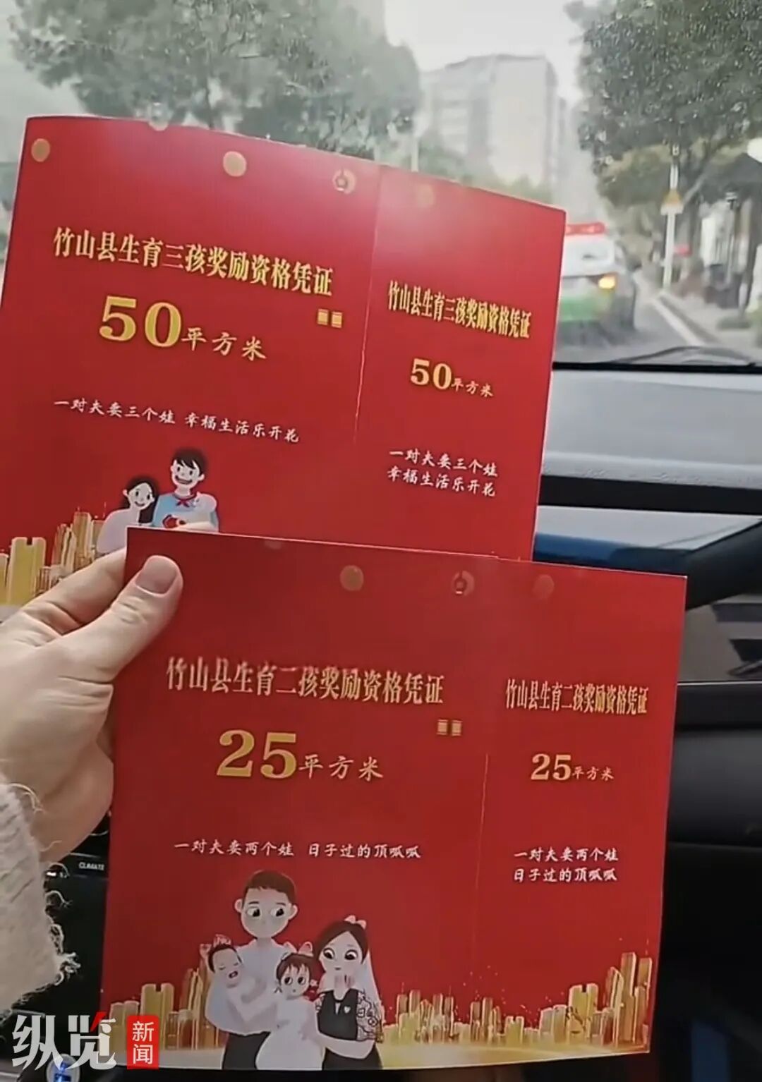 “生育二孩购房奖补25平方米,生育三孩奖补50平方米”。近日,有网友晒出一张“竹山县生育二孩奖励资格凭证”和一张“竹山县生育三孩奖励资格凭证”,称湖北十堰竹山县针对生育二孩、三孩家庭给予购房奖补,不少网友纷纷表示“真心羡慕了”。12月25日,竹山县卫生健康局工作人员告诉记者,当地的确有该政策,具体是二孩奖补25平方米、三孩奖补50平方米,两项还可叠加使用,具体要求以官方文件为准,目前市民反响普遍较好。
