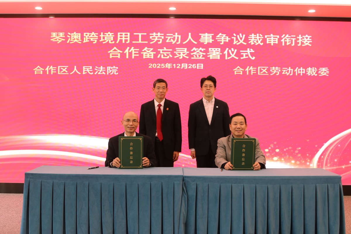12月26日下午,横琴粤澳深度合作区人民法院与横琴粤澳深度合作区劳动人事争议仲裁委员会联合举办琴澳跨境用工劳动人事争议裁审衔接合作备忘录签署仪式,双方将携手搭建“仲裁+法院”协同解纷新模式,此举标志着合作区在构建高效、便捷、公正的跨境用工争议解决机制方面迈出关键一步,旨在为琴澳深度融合提供坚实法治保障。