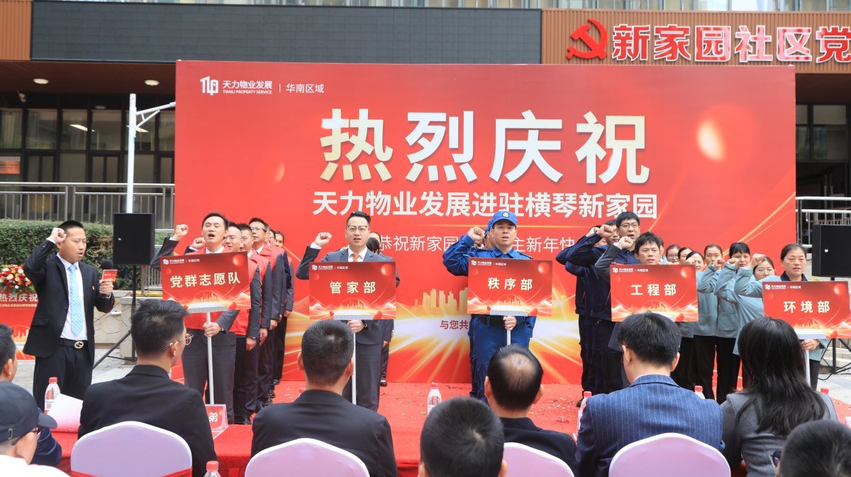 12月31日上午,横琴粤澳深度合作区新家园小区中心广场彩旗飘扬,广州天力物业发展有限公司(下简称“天力物业”)中标新家园小区服务项目进驻仪式举行。这场仪式不仅标志着小区物业服务正式升级,更因合作区首个业主完全自主决策的物业选聘案例,成为横琴基层治理现代化的生动注脚。
