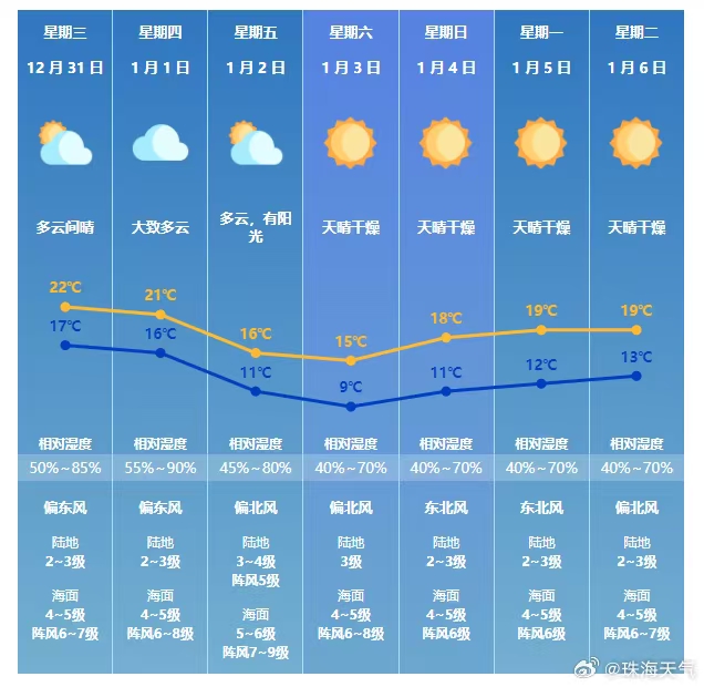 预计珠海市31日至1月1日(元旦)以多云天气为主,日间温暖舒适;1月2日-3日受较强冷空气影响,气温显著下降,北风清劲,体感寒冷。