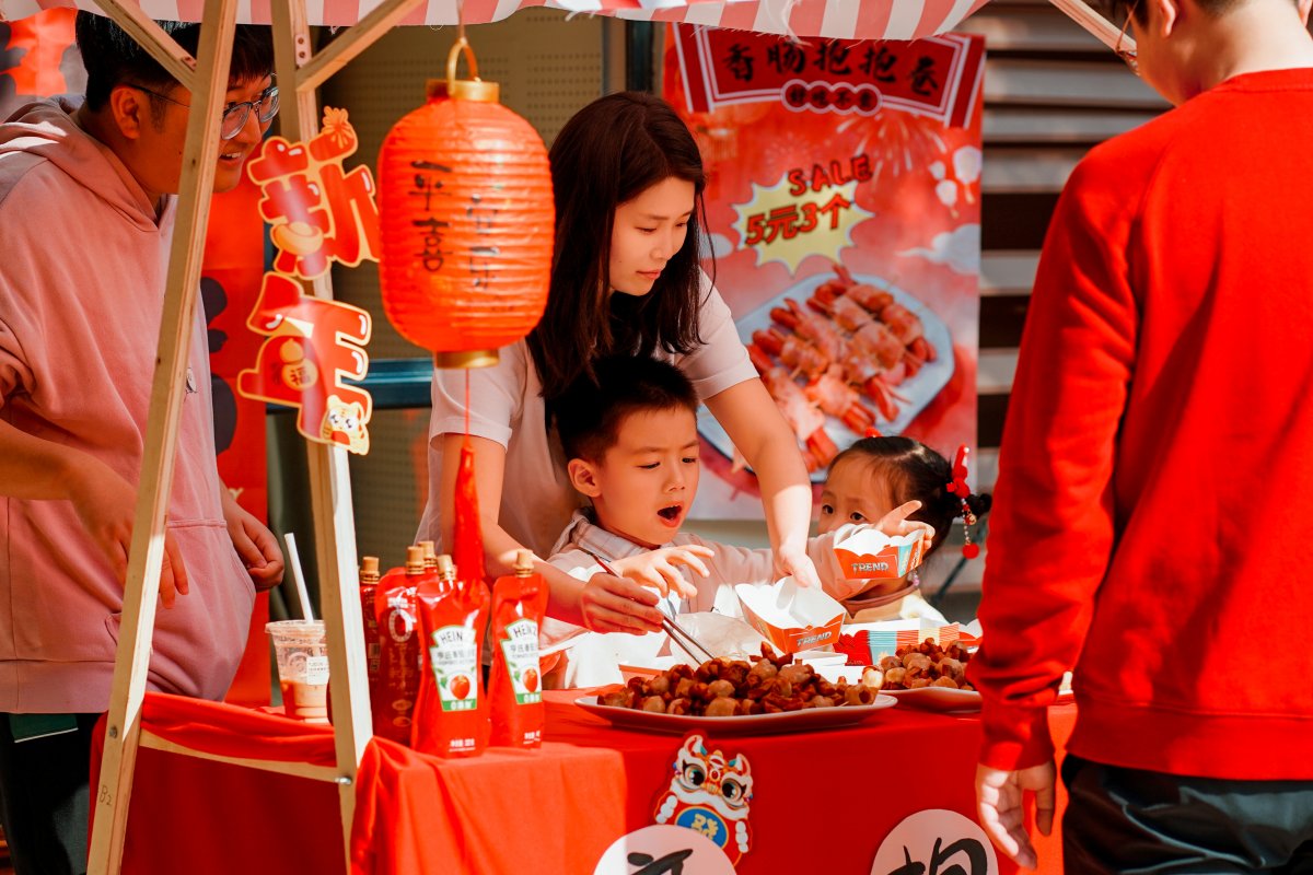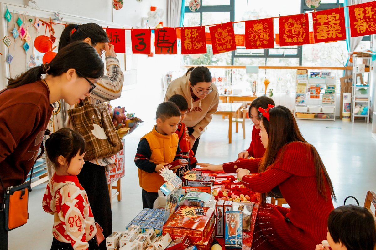 本次活动以“游园为形、文化为魂”,现场设有12个传统美食摊位及36个游戏、手工及饰品摊位,构成一座微缩版传统文化市集。孩子们在家长陪伴下,品尝龟苓膏、钵钵鸡等地方风味,体验“纸杯传福”“福字拓印”“巧手制香囊”等趣味项目,并在零食盲盒、刮刮乐等创意摊位前流连忘返。幼儿园还为每个家庭准备了丰盛的亲子自助餐,在温馨共餐中进一步凝聚家园情感。