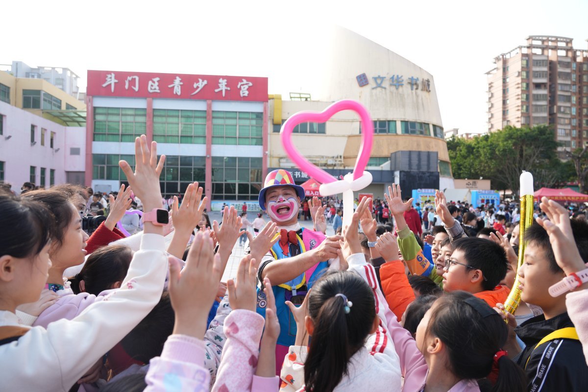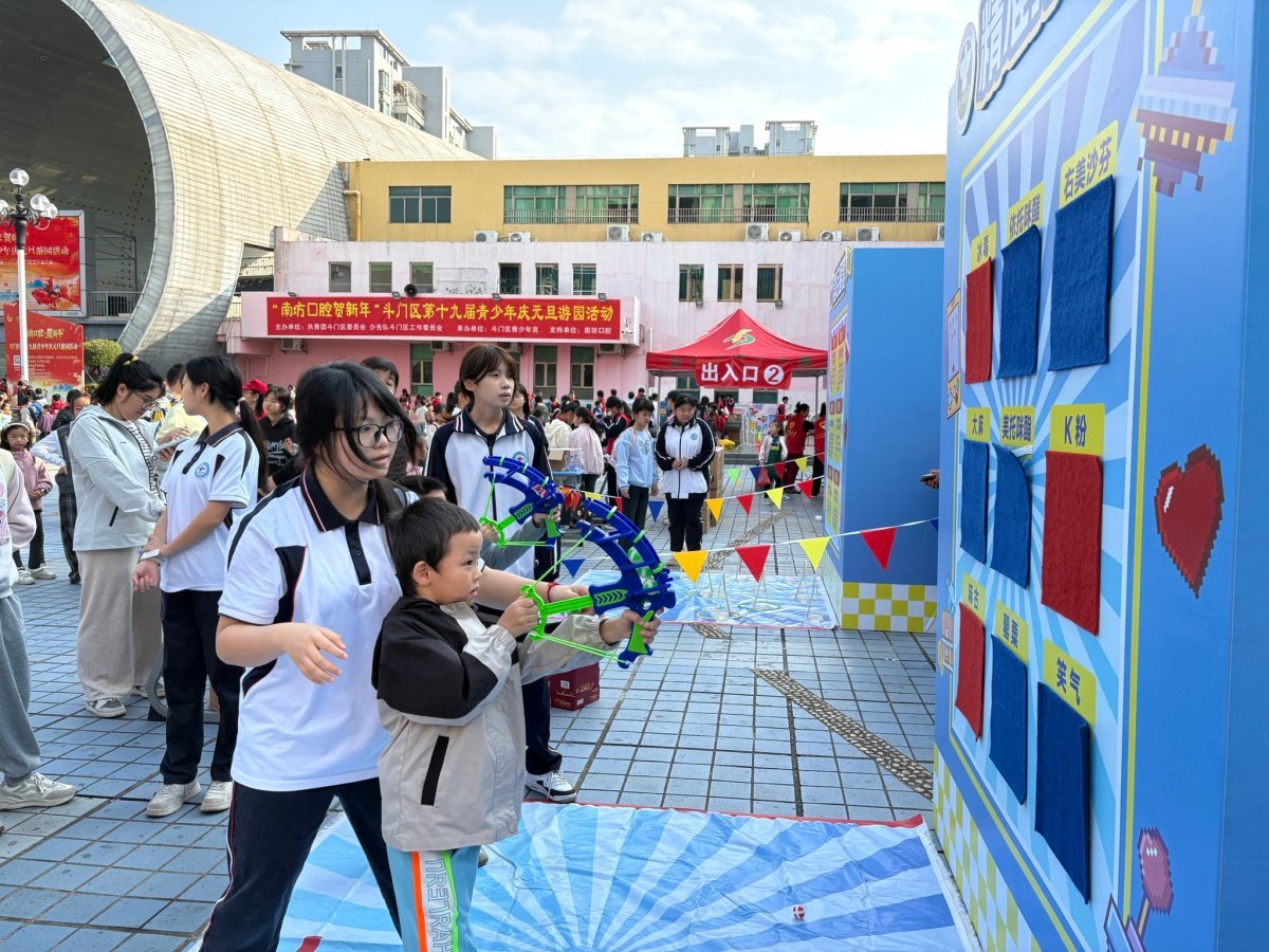 1月1日9时,斗门区青少年宫红领巾广场上,小丑的精彩表演与互动瞬间点燃全场,化作孩子们的欢乐海洋。由斗门团区委、斗门区少工委联合斗门区青少年宫主办,南坊口腔独家支持的“南坊口腔贺新年”第十九届青少年庆元旦游园活动在此上演。1310名少年儿童穿梭于各个游戏项目之间,在趣味互动中解锁新年惊喜,以蓬勃朝气开启幸福成长新征程。