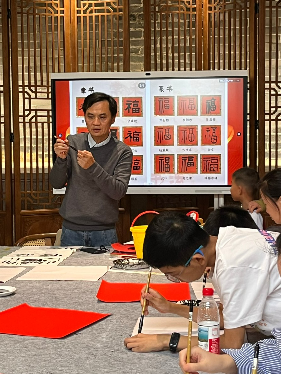 活动伊始,珠海高新区美术家协会主席薛建庆为现场观众带来了一场生动的书法导览。他从毛笔、墨、宣纸的选用讲起,细致阐述了下笔前的整体布局、握笔行笔的要领,并沿着汉字演进的脉络,将甲骨文的源起,篆、隶、草、楷、行诸体的流变历程娓娓道来。为加深观众的理解,薛建庆现场挥毫,以“福”字为例,不仅解析其字形源流,更以五种书体逐一演示,笔墨流转间尽显汉字之美。